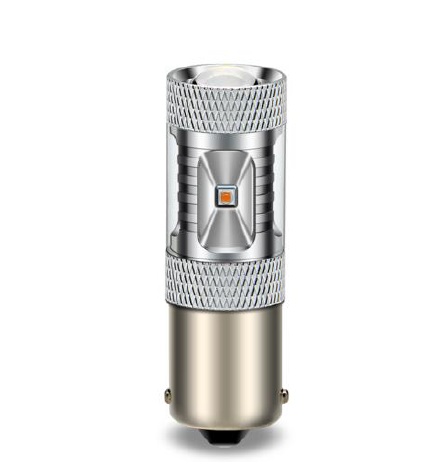 Stipriai geltona CREE LED “BA15S / P21W, BAU15S/ PY21W ” – aukščiausios galios 30w cree led posūkių žibintų lemputė su lešiu priekyje. Rekomenduojame į Amerikietiškų (JAV) automobilių posūkių žibintus. Posūkiai švies geltonai, nors žibintų stiklai raudoni.